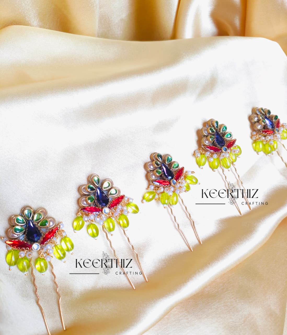 3D designer U-pin with layered stones, beads, and premium detailing — perfect for bridal buns, updos, and festive hairstyling.