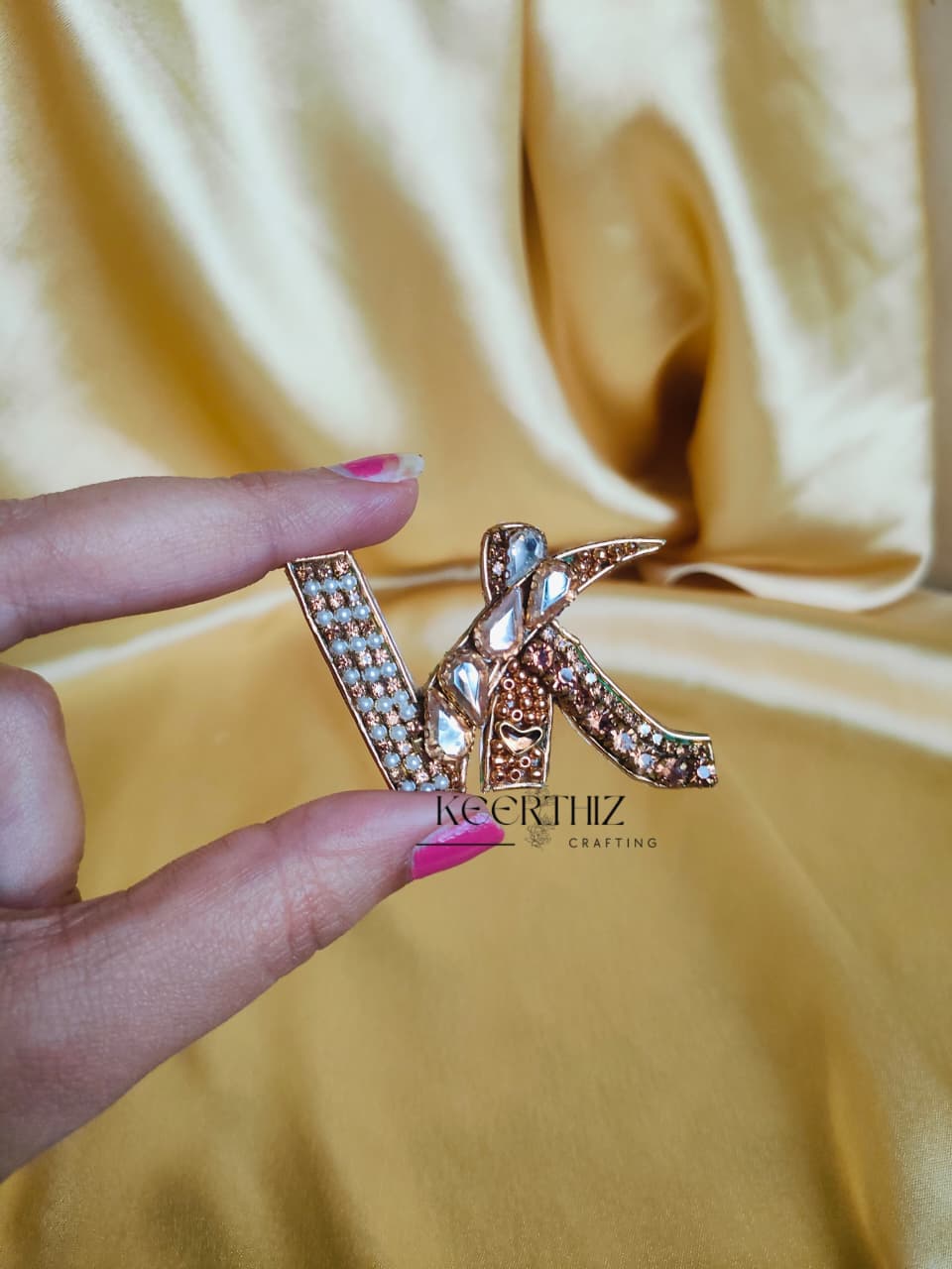 These brooches were specially made for a reception where the groomsmaid team and the groom wore personalised letters. This collection includes Y, U, N, V, and an exclusive VK combined brooch created for the groom. Every piece is customisable in colour, style, and letter choice, making it suitable for themed weddings, coordinated entries, photography, and gifting.