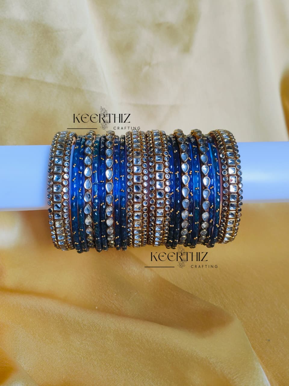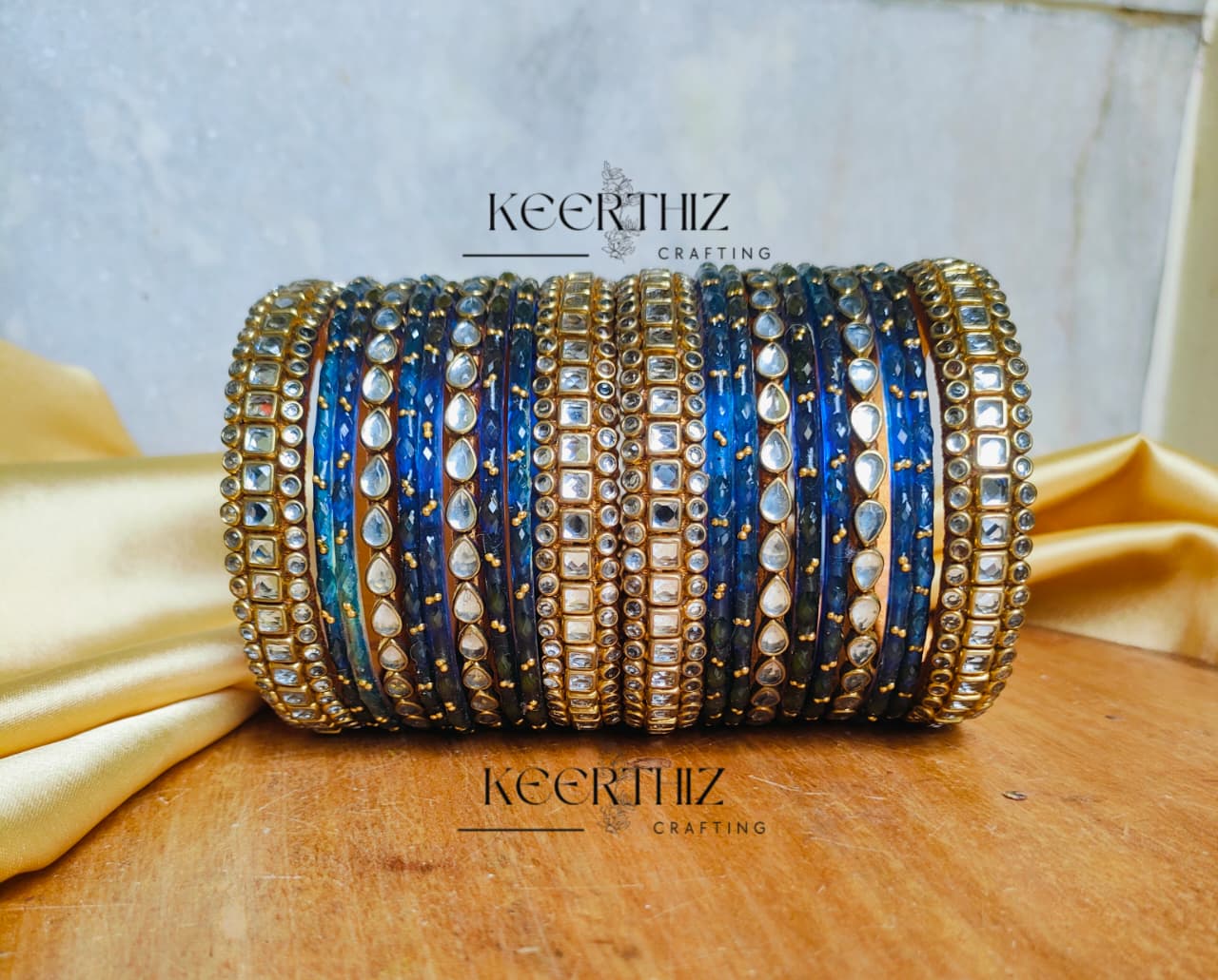 kundan with glass bnagles bridal sets These royal blue semi-kundan bridal bangles are a perfect blend of tradition and elegance, crafted with vibrant kundan stones and a rich gold-toned finish with beautiful rain drop glass bangles . Designed for comfort yet radiating grandeur, they complement both bridal and festive attire. Ideal for weddings, receptions, engagements, festivals, and traditional ceremonies, these bangles add a timeless charm to any bridal collection. 3d bangles . Available in multiple shades and customizable to match outfits, they serve as stunning keepsakes as well as memorable gifts for brides.
