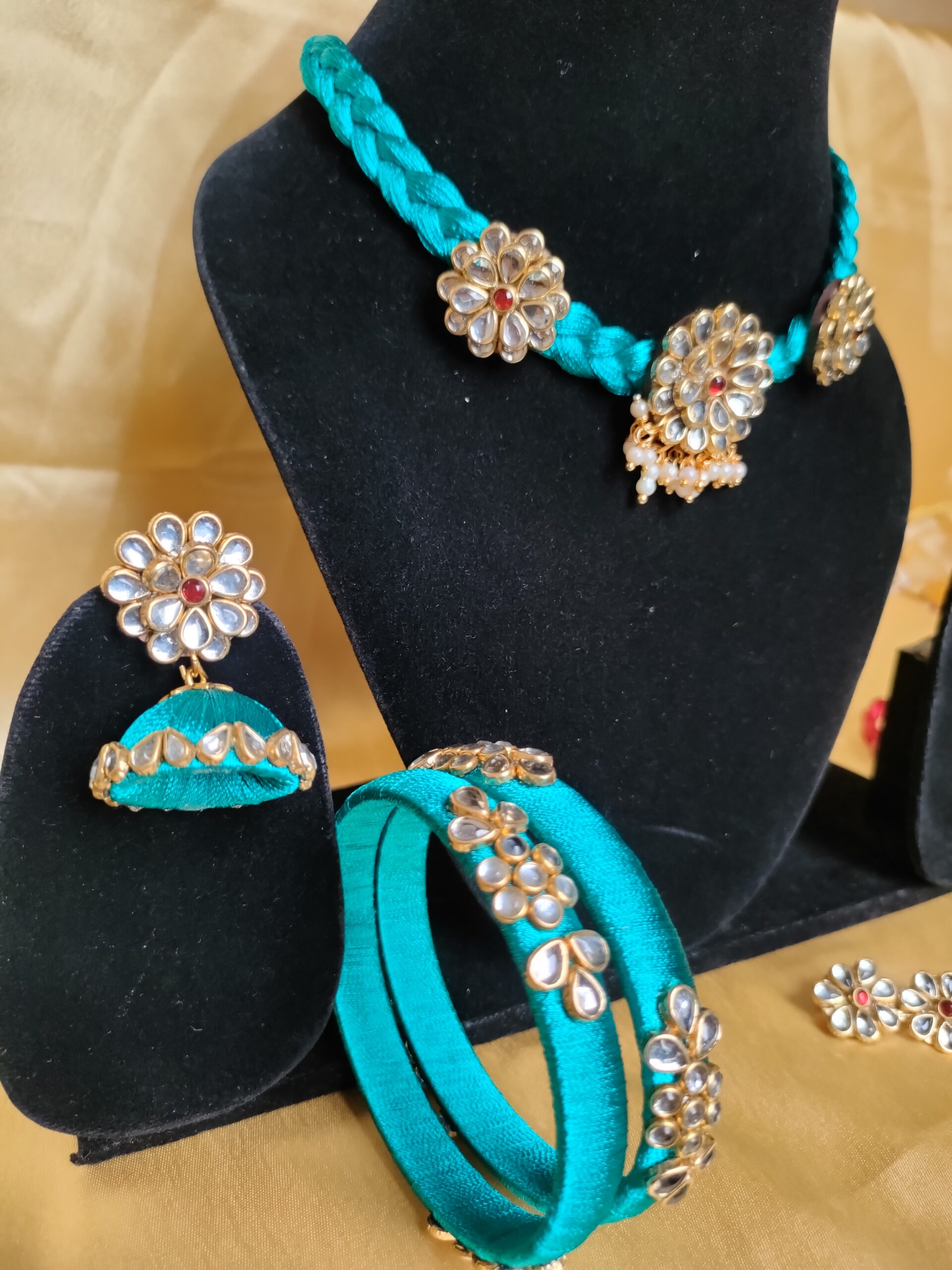 At Keerthiz Crafting, every piece of jewelry is thoughtfully handmade to reflect cultural heritage with a modern twist. This traditional silk thread jewelry set for weddings and parties is not only stylish but also comfortable to wear for long hours. The combination of necklace, earrings, bangles, and saree brooch makes it a complete jewelry solution for anyone who wants to stand out.